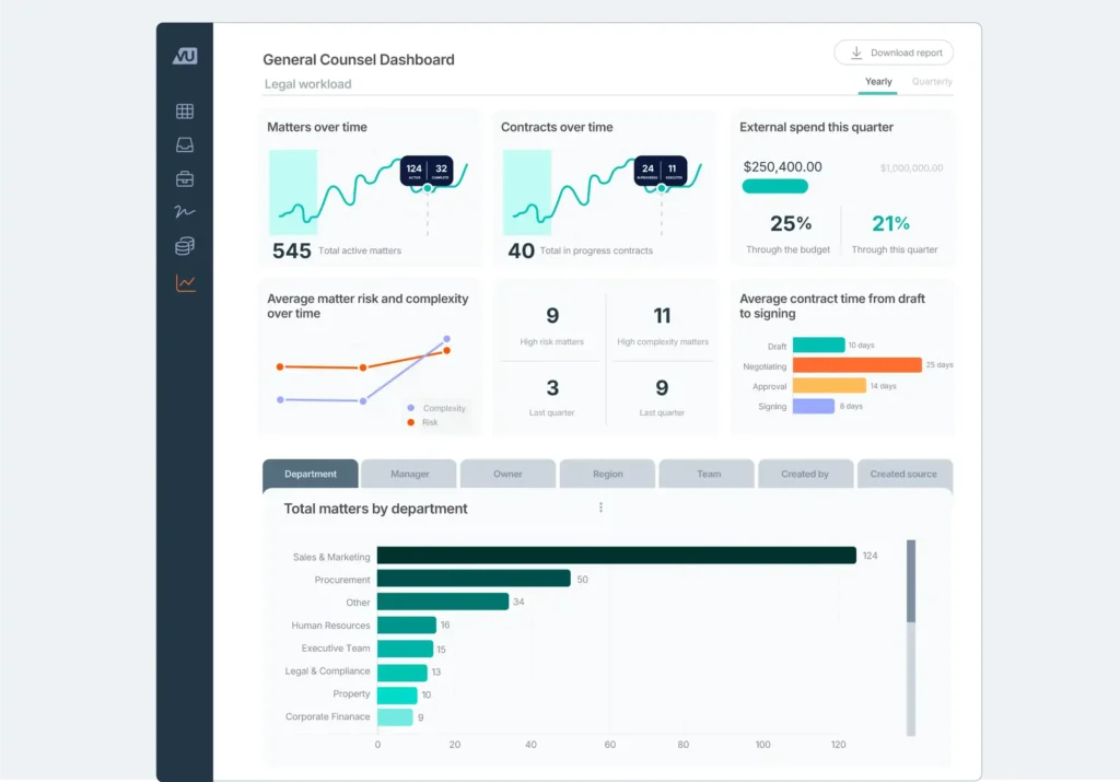 - Workflow tracking: Notifications and dashboards give both legal and the business full visibility into matter statuses, reducing endless “where is this at?” follow-ups
