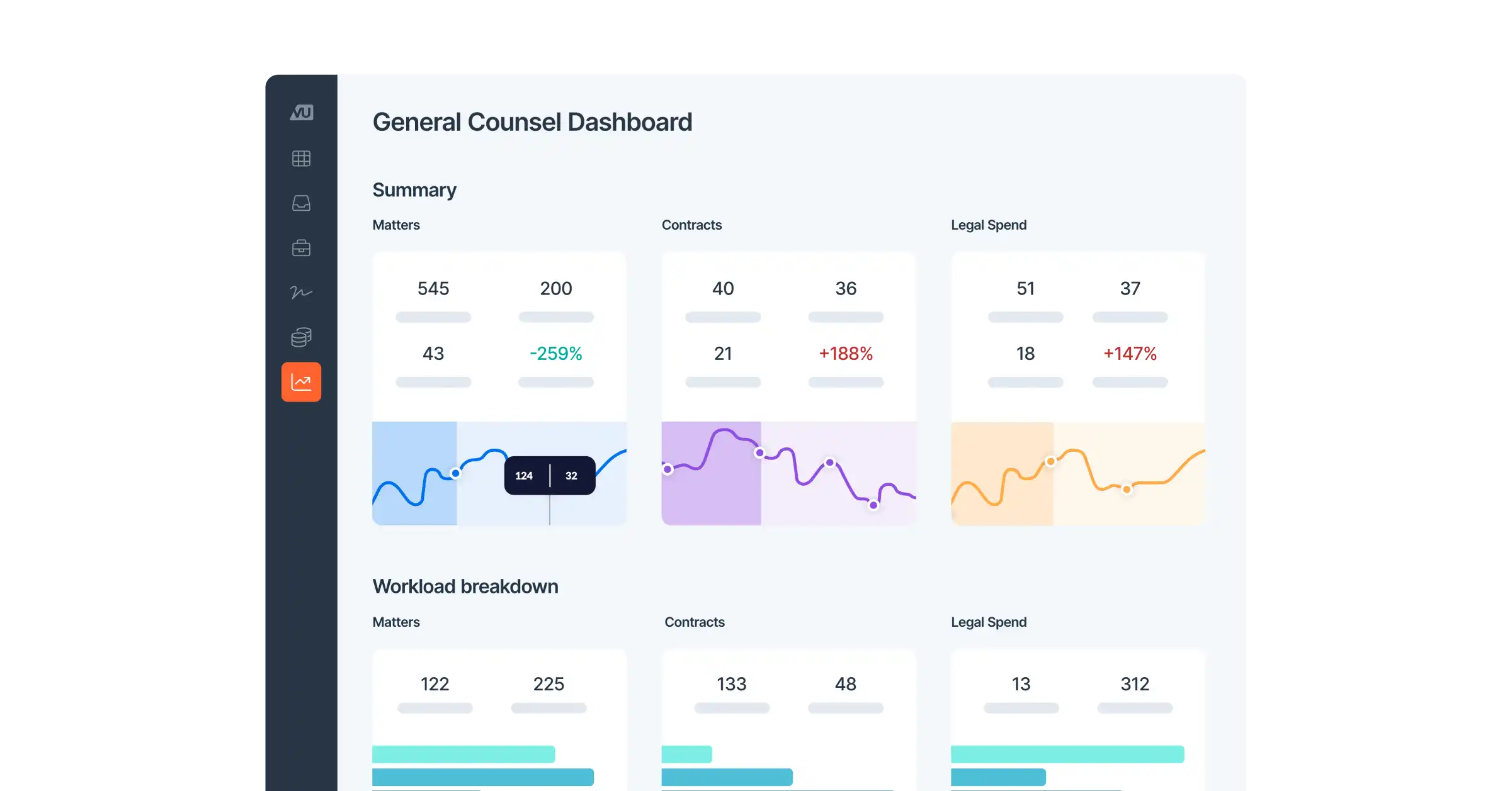 Solution: Built-in analytics and reporting tools automatically surface metrics on volume, cycle times, and workload trends ā turning data into insight, demonstrating legalās value to the business, enabling proactive resource planning, and highlighting opportunities to create templates, automate, and improve processes for reoccurring matter types and questions.